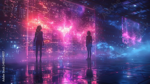Futuristic Virtual Reality Experience with Two Users Exploring Digital Worlds