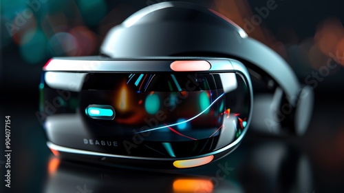 Futuristic VR headset with colorful light reflections on the lens, ideal for gaming and virtual reality experiences.