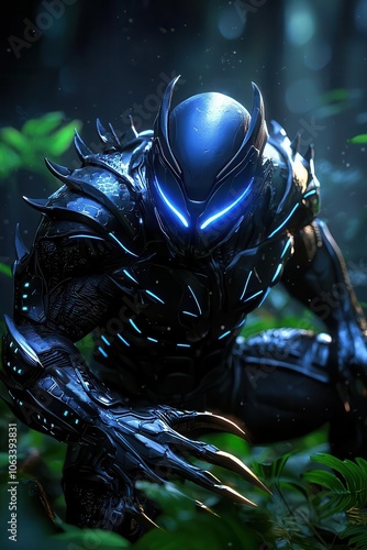 Futuristic warrior in a dark forest, showcasing glowing blue elements and intricate armor design, evoking a sense of mystery and adventure.