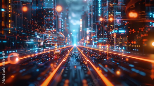 Futuristic Wearable Tech Close-Up: Integrating Gadgets Seamlessly into Daily Life, Overlay layers with city background and holograms of technology icons are in the foreground, intersected by glowing