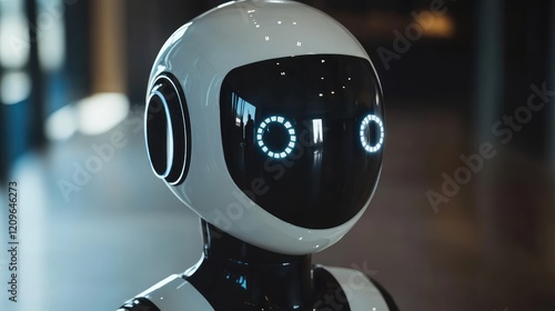 Futuristic white robotic advisor with glowing digital eyes in a modern office environment conceptualizing cryptocurrency investment strategies.