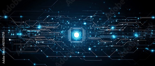 Futuristic white tech elements and digital connections on a dark blue background, representing the future of digital communication and advanced technology systems