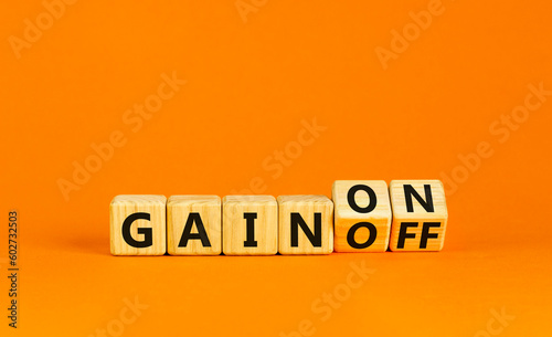 Gain on or off symbol. Businessman turns wooden cubes and changes word Gain off to Gain on. Beautiful orange table orange background. Business and gain on or off concept. Copy space.