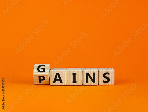 Gains and pains symbol. Turned wooden cubes, changed word pains to gains. Beautiful orange background. Business, pains and gains concept. Copy space.