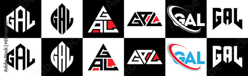 GAL letter logo design in six style. GAL polygon, circle, triangle, hexagon, flat and simple style with black and white color variation letter logo set in one artboard. GAL minimalist and classic logo