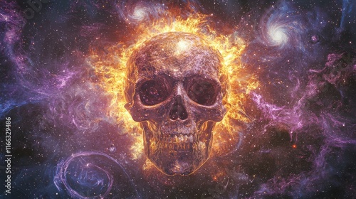 Galactic Skull: Fiery Sun, Swirling Galaxies, Metal Aesthetics - 3D Render Digital Artwork