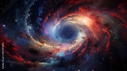 Galactic spiral with black hole and nebula vortex, teeming with stars and planets. AI generative.
