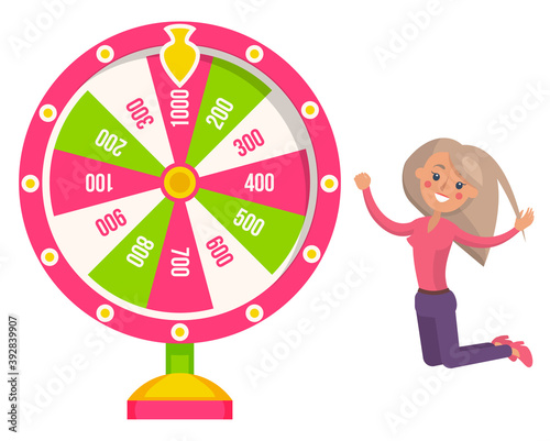 Game fortune wheel. Girl playing risk game with fortune wheel and lottery. Casino and gambling. Illustration of casino fortune, wheel winner game. Woman won, joyfully raised her hands up and jump