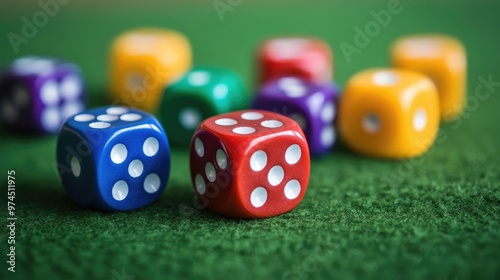 Gaming dice in various bright colors, scattered over a green table, adding a playful and energetic atmosphere.