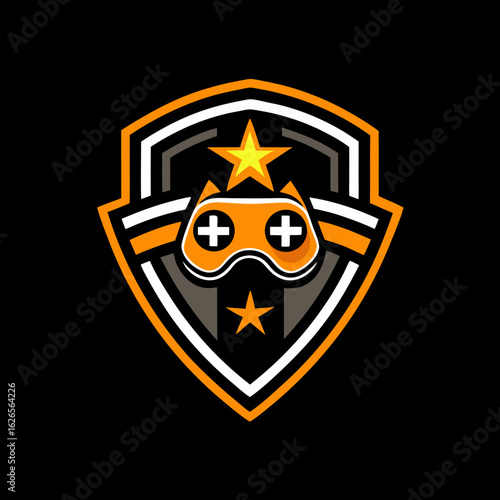 Gaming Mascot Logo with Controller Stars and Shield on Black Background