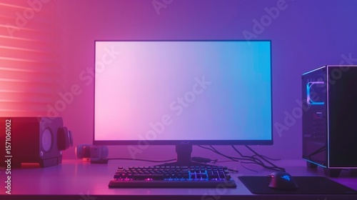 Gaming PC with isolated screen for mockup, app or game presentation. Modern case with RGB light, keyboard and mouse on desk.