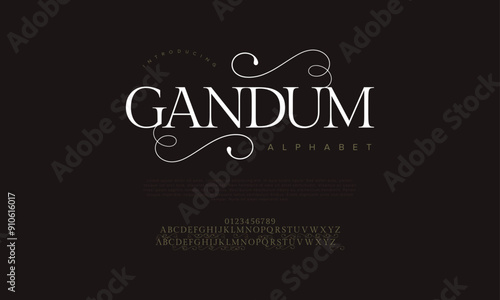 Gandum swash luxury elegant alphabet letters and numbers. Vintage wedding typography classic serif font decorative vintage retro. creative vector illustration
