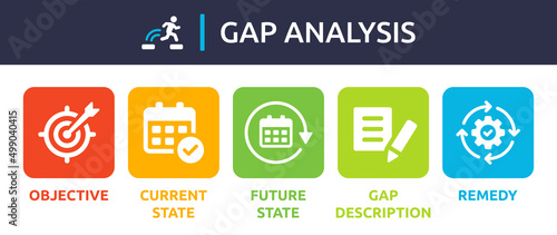 Gap Analysis vector. Objective, current state, future state, gap description and remedy icon sign.