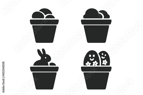 Garden decor solid glyph icon set. Flower pot decorations collection. Gardening hobby concept. Includes decorative stones, moss, easter bunny figurine, and painted rocks.