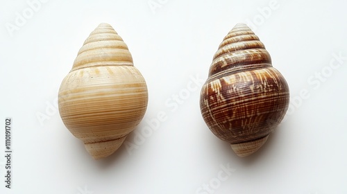 Garden snail shells displayed separately on a white background showcasing natural textures and colors for educational or decorative use.