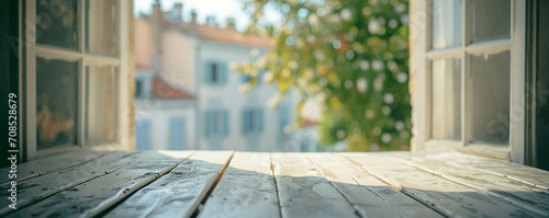 garden view blurred with bokeh out of open window, Mock up banner for display of advertise product.