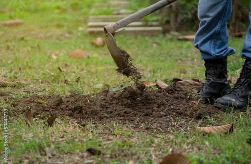 gardener digging soil to make hole for planting tree in the garden, soft focus