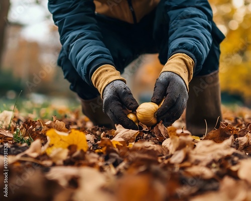 Gardener Planting Bulbs in Autumn Leaves Preparing for Spring s Blooms with Patience and Foresight