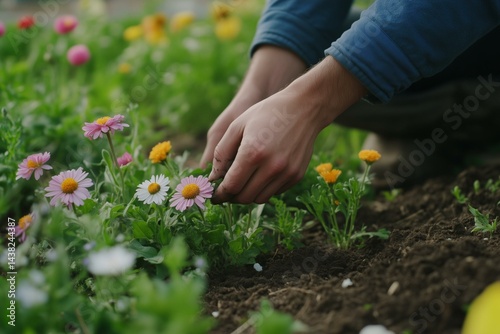 gardener plants flowers in the garden close-up, garden care, gardening concept