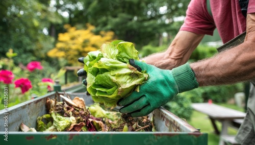 Gardening: Adding wilted lettuce to compost bin, improving soil health naturally. Sustainable practices for home gardening.