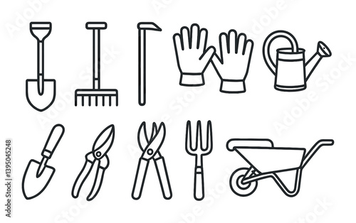 Gardening essentials icon set: linear style tools for horticulture enthusiasts