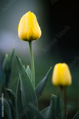 Gardening in the spring. Yellow tulips in the garden. Tulips, selective focus. Vertical view.