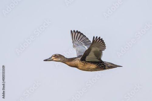 Garganey in flight. The garganey (Spatula querquedula) is a migratory secretive dabbling duck