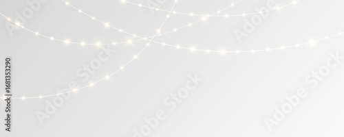 Garland, festive, light, yellow, PNG glowing decoration element. Transparent background with Overlay effect. Sparkle shine bulbs create holiday mood for vector Christmas and party design.
