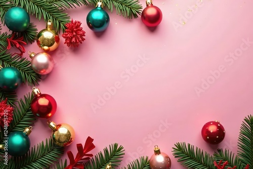 Garlands of colorful Christmas ornaments on a pink background, green, ornaments