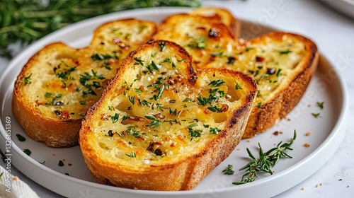 Garlic bread slices with melted butter, herbs, and chili flakes on a white plate