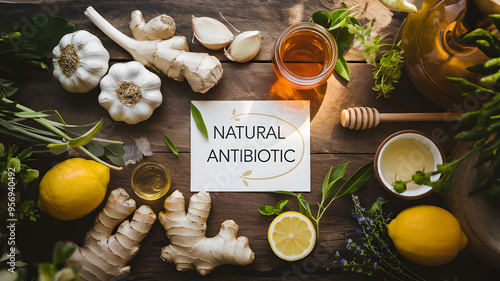 Garlic, ginger, lemon, honey, and fresh herbs are arranged around a card reading "Natural Antibiotic" on a rustic wooden surface. Emphasizes natural healing, immune system support, and the benefits of