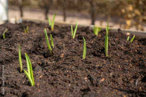 Garlic growing in pallet garden in early spring.