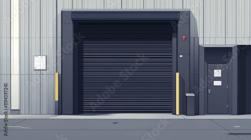Gate with black rolling shutter in gray wall. Vector realistic illustration of hallway in garage or warehouse with closed and open roller up blinds. Building facade with automatic doors
