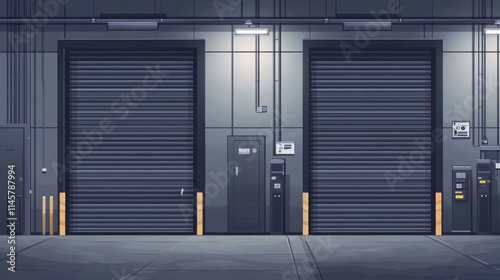 Gate with metal rolling shutter in gray wall. Vector realistic illustration of hallway in commercial garage or warehouse with closed and open roller up blinds. Building facade with automatic doors