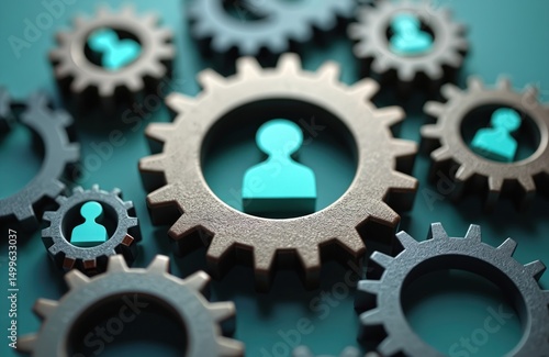 Gear icons represent teamwork, collaboration. Human figures in gears showcase connection concept, partnership, leadership, business, organization, efficiency, innovation. Team, support, synergy