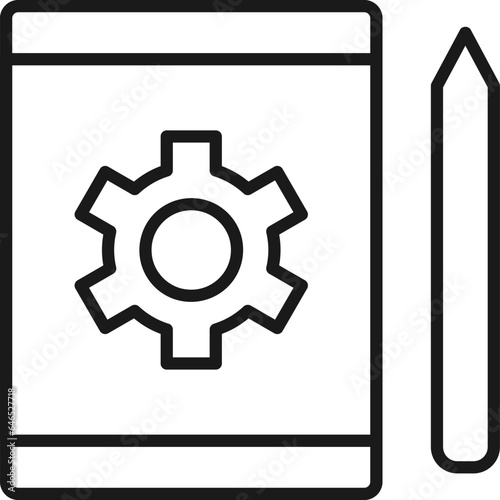 Gear or Cogwheel on Tablet Isolated Line Icon. Perfect for web sites, apps, UI, internet, shops, stores. Simple image drawn with black thin line