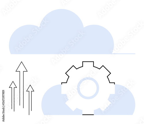 Gear overlaying soft blue clouds and upward-pointing arrows representing cloud technology, performance, innovation, and growth. Ideal for technology, efficiency, productivity, cloud services, IT