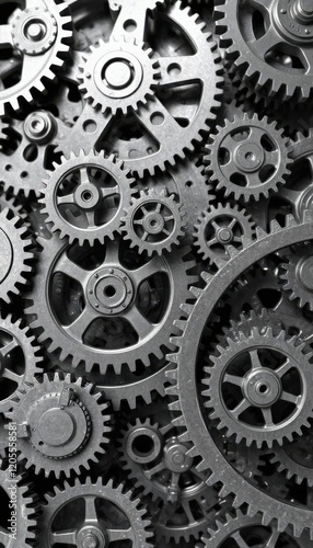 Gears and cogs wheels, vertical industrial background. Artwork digital illustration. From above technical texture of steampunk gears on metal dark background. Gears of the mechanism. Wallpaper design