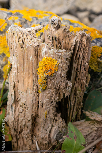 Gelbe Flechten und Pilze auf Steinen und Holzpfähle an einer Buhne an der Nordsee