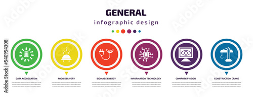 general infographic element with icons and 6 step or option. general icons such as data aggregation, food delivery, biomass energy, information technology, computer vision, construction crane
