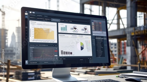 Generate a photo realistic image of a construction project displaying an expense tracking dashboard with real-time cost monitoring and budgeting details; ensure the image is of high resolution