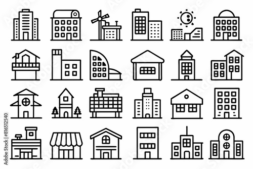 generate a Set of 45 outline icons related to building, architecture, house, design. Linear icon collection. Outline icon collection. line art. Pictograms and infographics for mobile apps