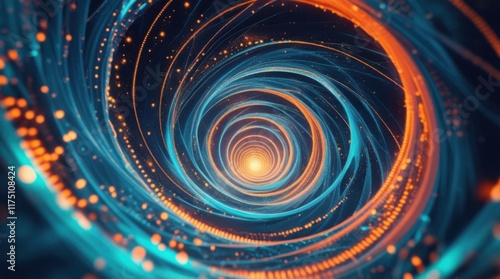"Generate an abstract digital artwork that depicts a cosmic vortex or galactic swirl. The design should feature intricate, glowing lines and particles arranged in spiral patterns...