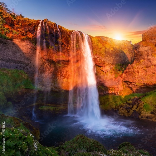 Generated image Immerse yourself in captivating beauty of a sunset waterfall