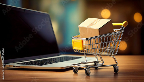 Generated image a box inside the cart in front of a laptop; online shopping concept;