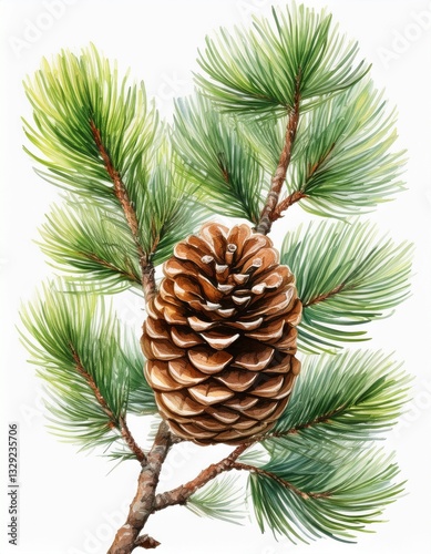 Generated image Pine branch with pine cone isolated on background, Conifer branch watercolor botanical paint