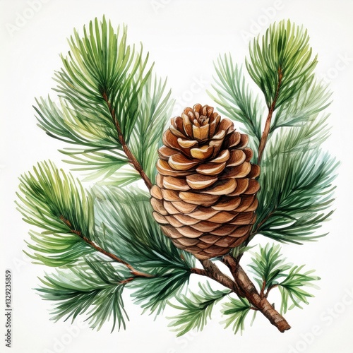 Generated image Pine branch with pine cone isolated on background, Conifer branch watercolor botanical paint