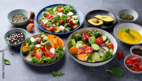 Generated image Set of vegetarian fresh vegetable salads. Healthy, proper nutrition