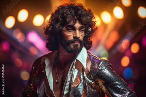 Generated with AI picture of a happy cheerful glamour e;elegant person enjoying the weekend in night club 70s 80s theme party