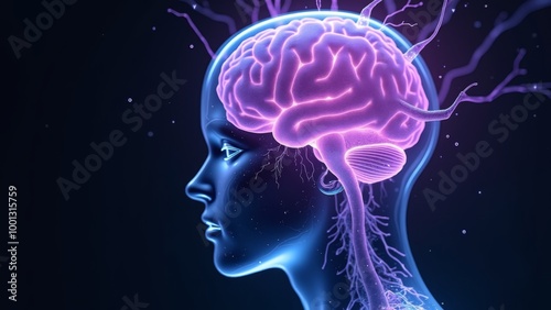 Generative AI, a human head with a glowing brain in the middle of it's head and a glowing light coming from the brain, facial muscles, a stock photo, neoplasticism